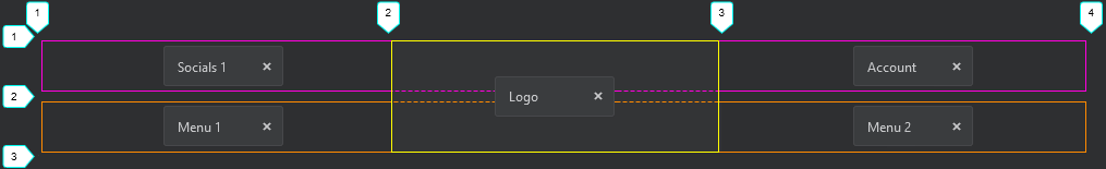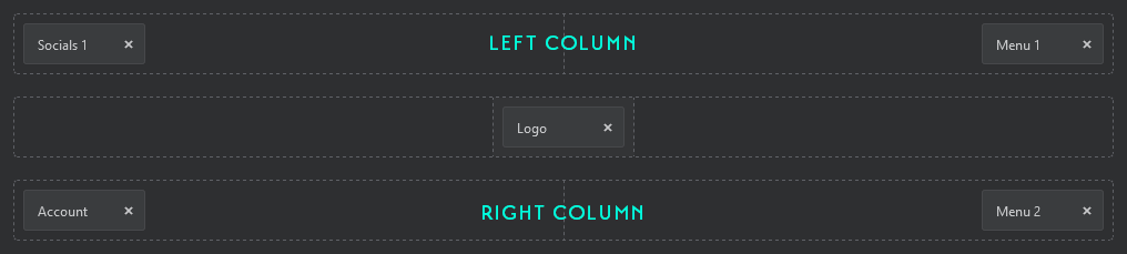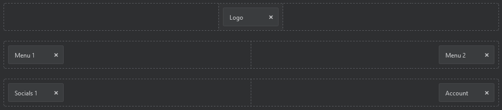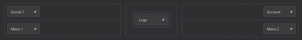 First up is to figure out where the elements in the Header Builder need to go to make this work. Since CSS Grid lets us turn the Header Builder’s vertical rows into columns, one solution would be to put the Social and Menu 1 elements as the left column, and the Account and Menu 2 elements as the right column, like this: